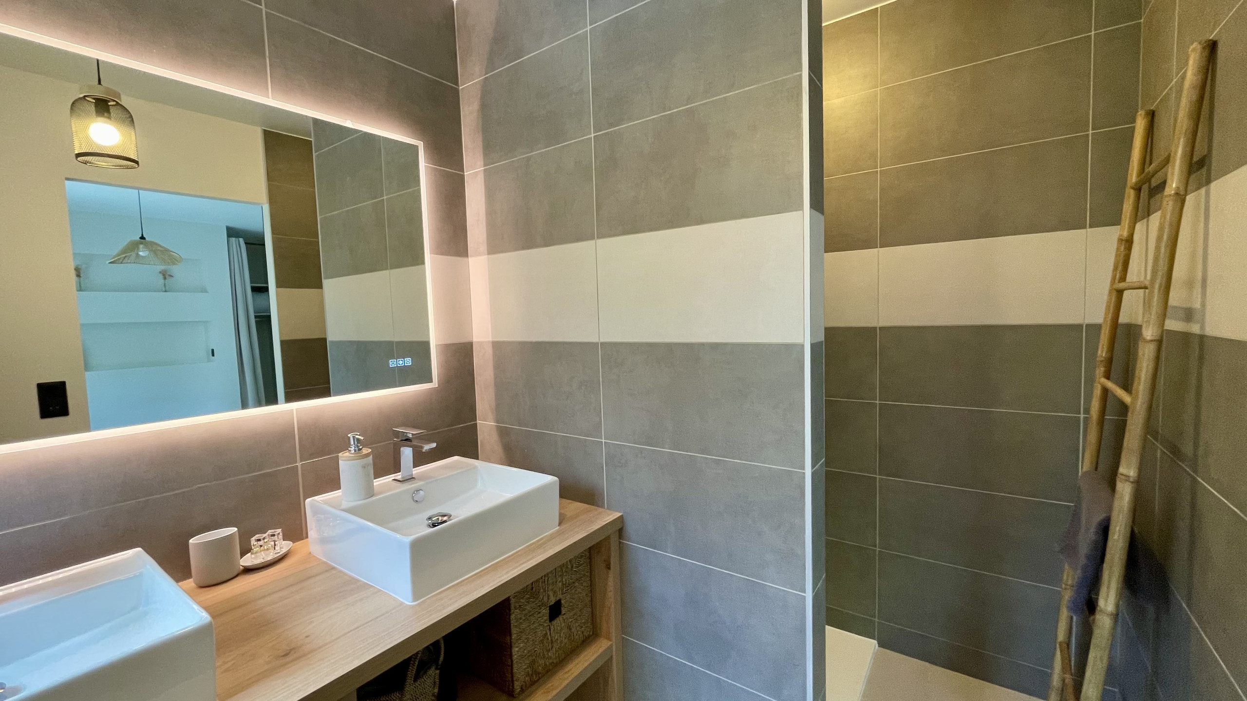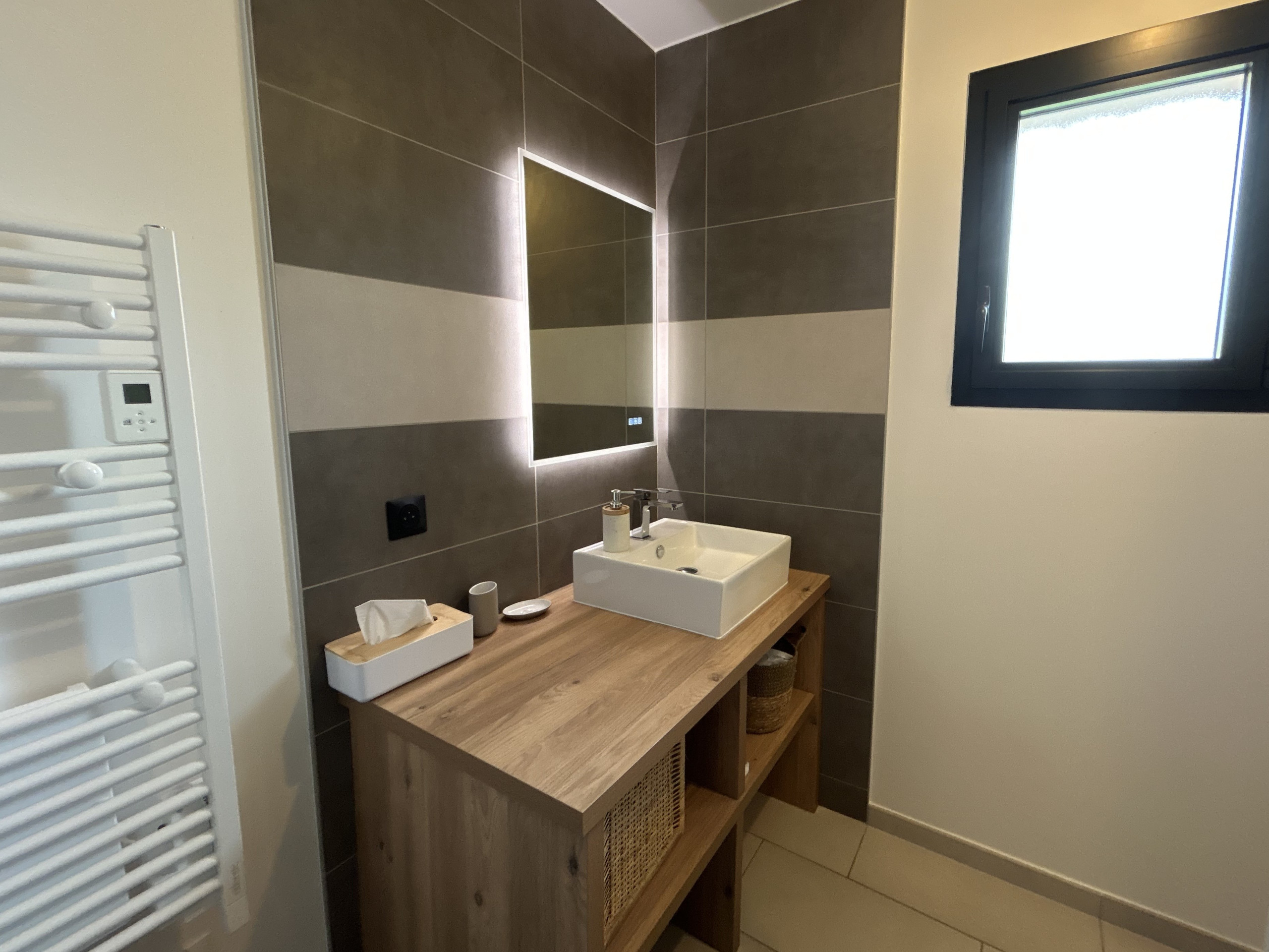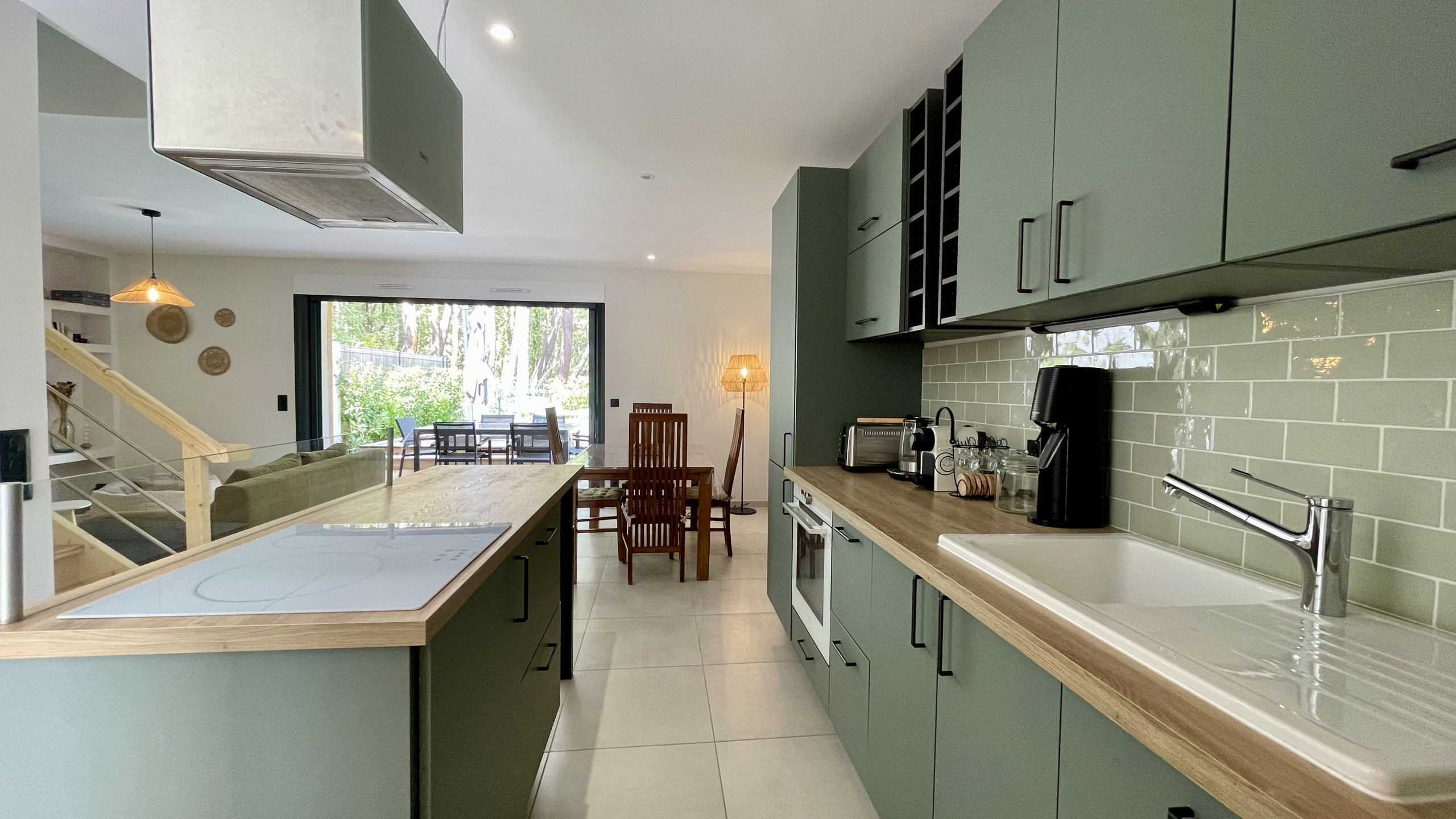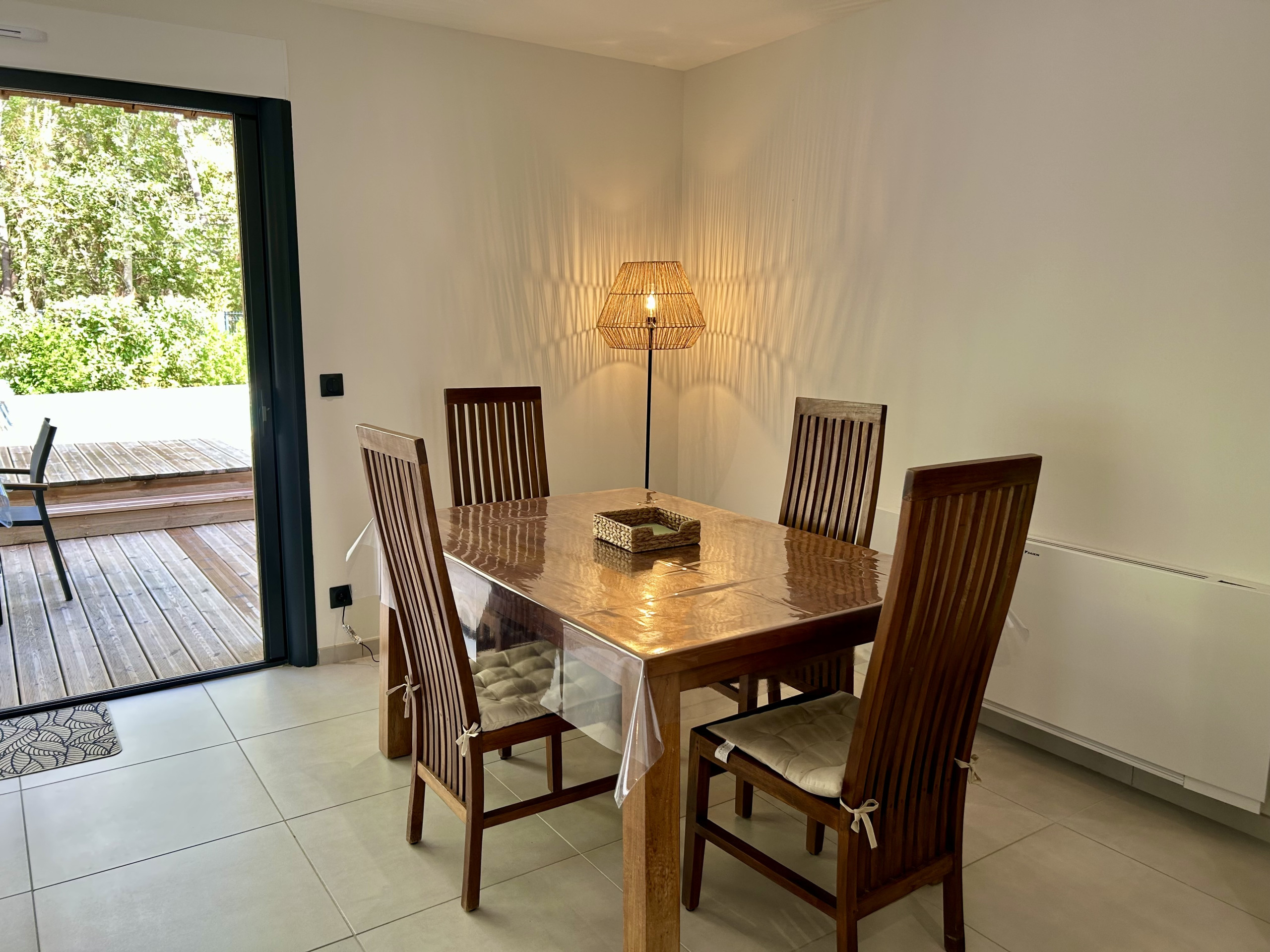 This 100m2 house offers a fully equipped kitchen (hob, oven, dishwasher, ...), as well as a large living area, which includes a welcoming lounge corner with two sofas and a TV, and a dining area that provides an ideal setting for relaxing moments with family or friends.