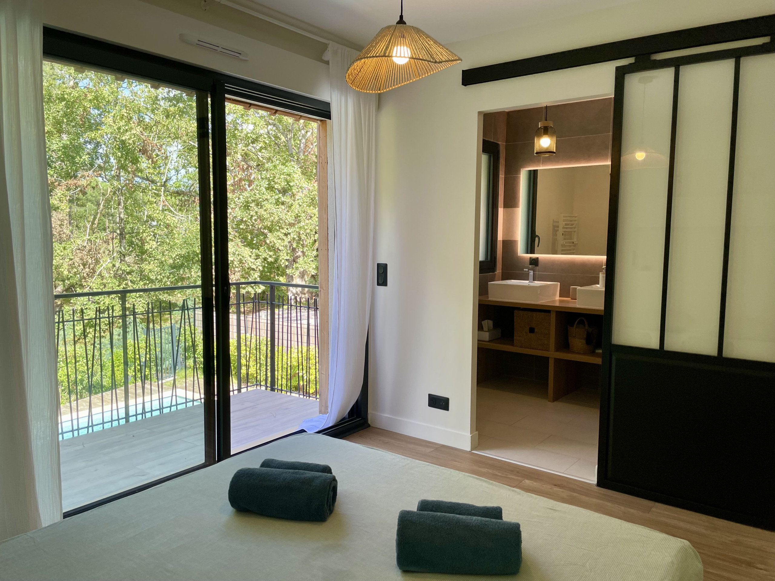 • Master Suite: Queen size bed, walk-in wardrobe, bathroom with shower and double sink, private balcony with view of pine trees and swimming pool, air conditioning