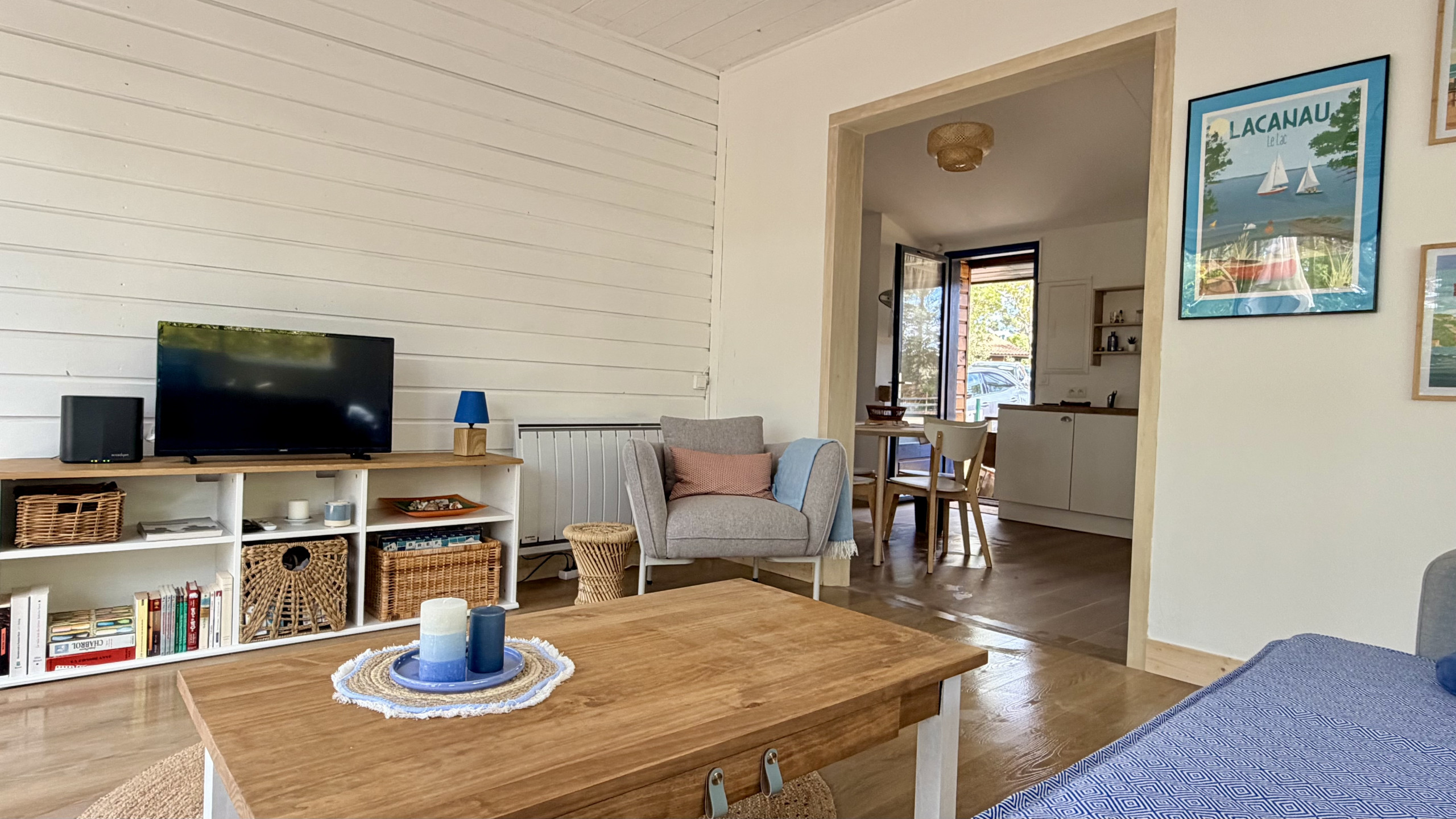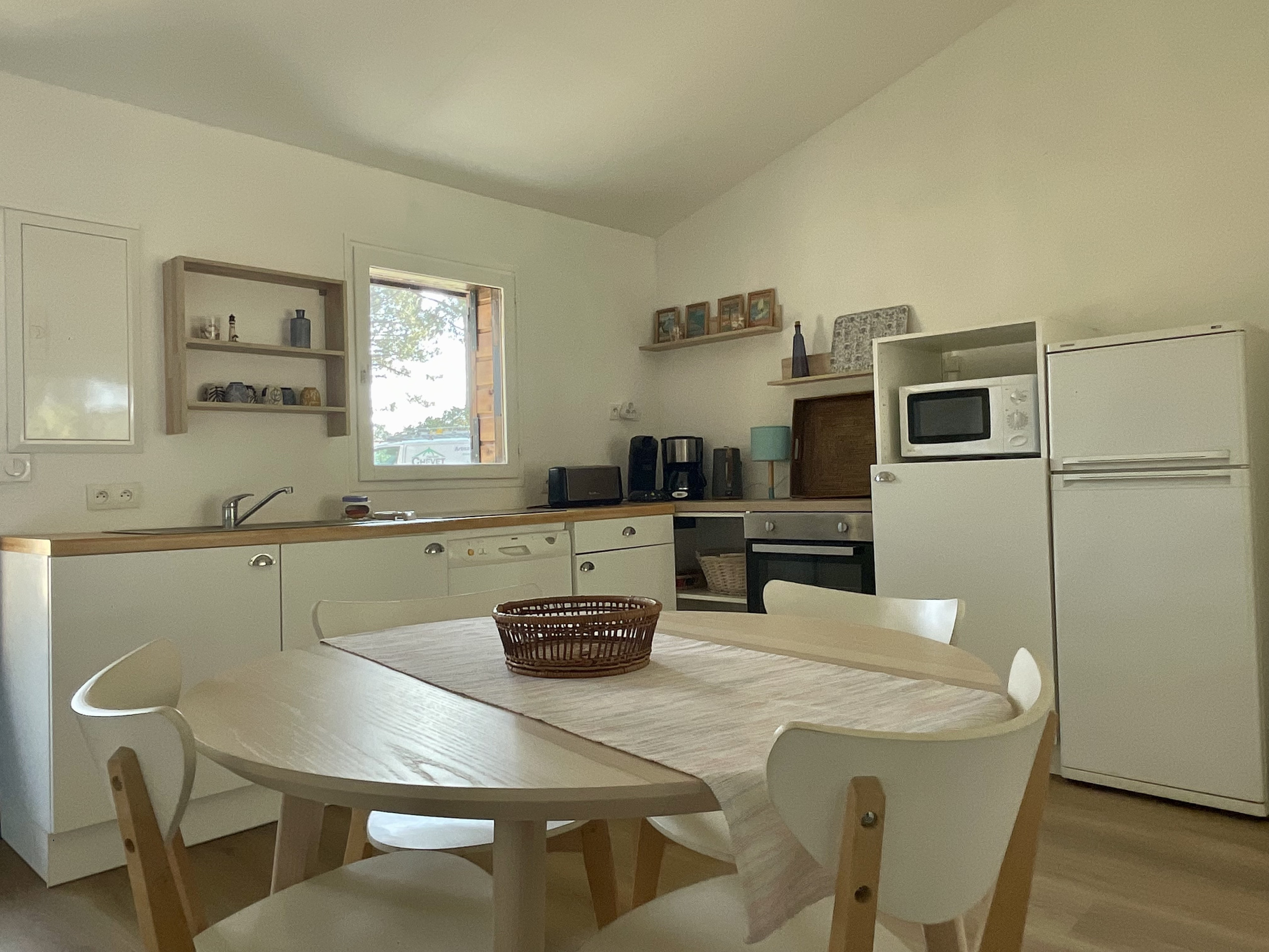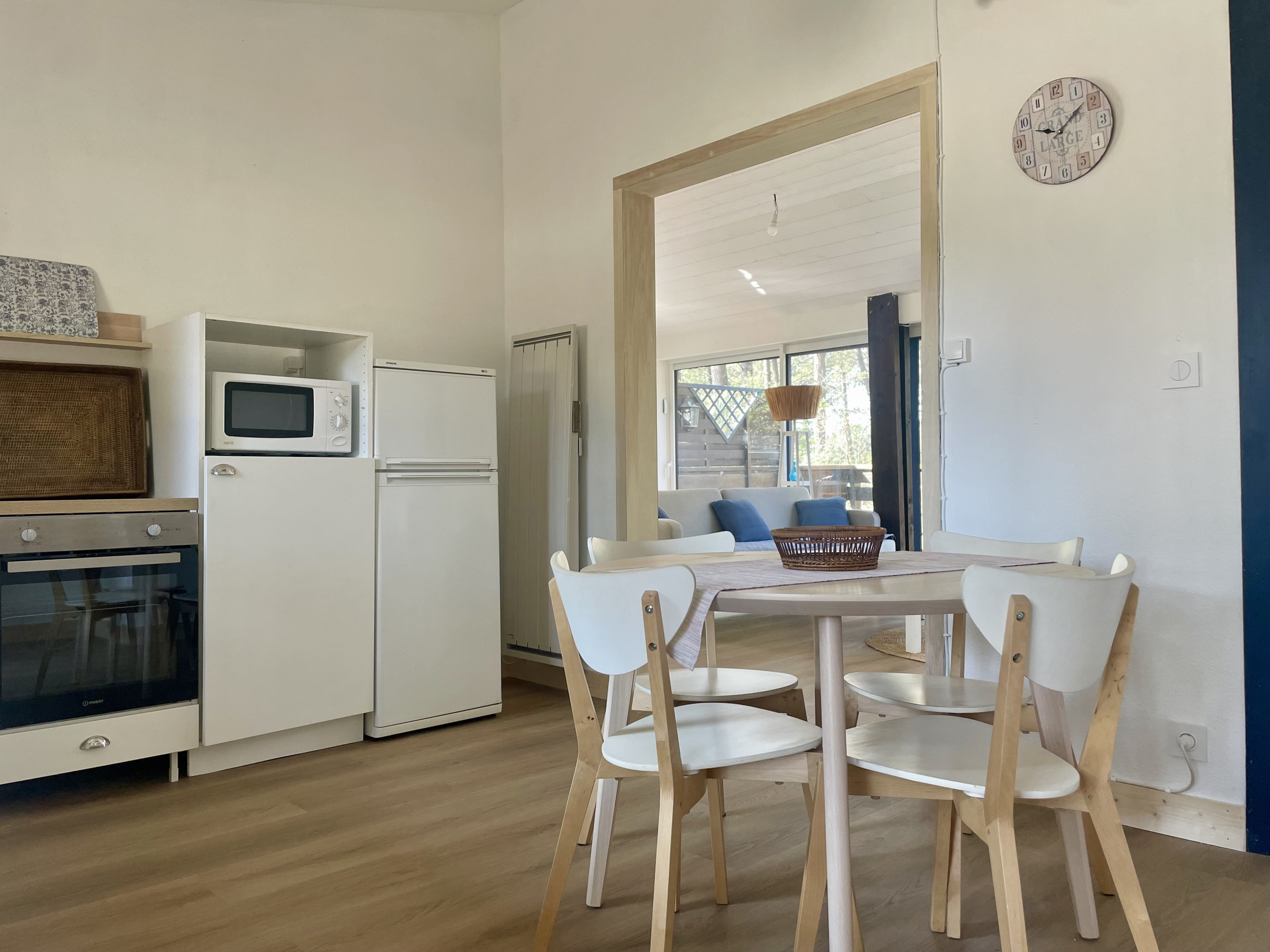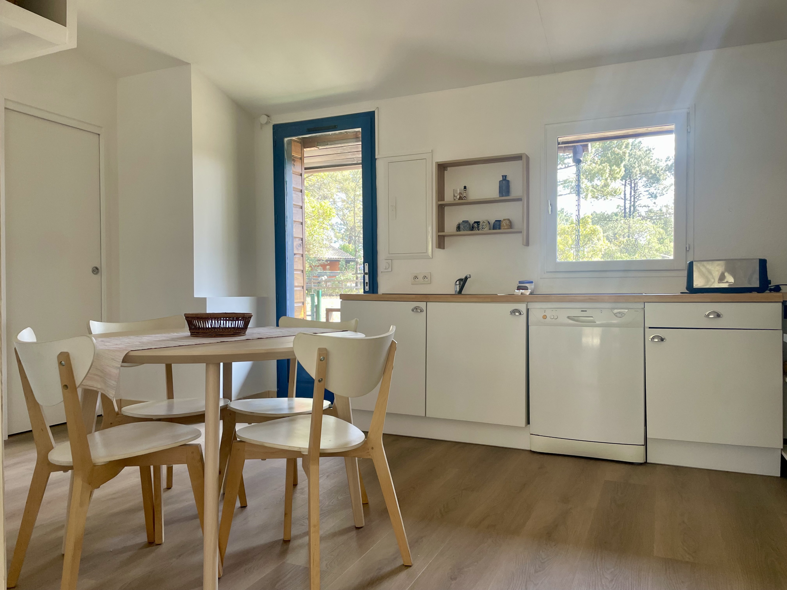 La casa se compone de una cocina completamente equipada con un espacio comedor, perfecta para compartir sus comidas. El salón luminoso se abre completamente a la terraza y dispone de un televisor para sus momentos de relajación.